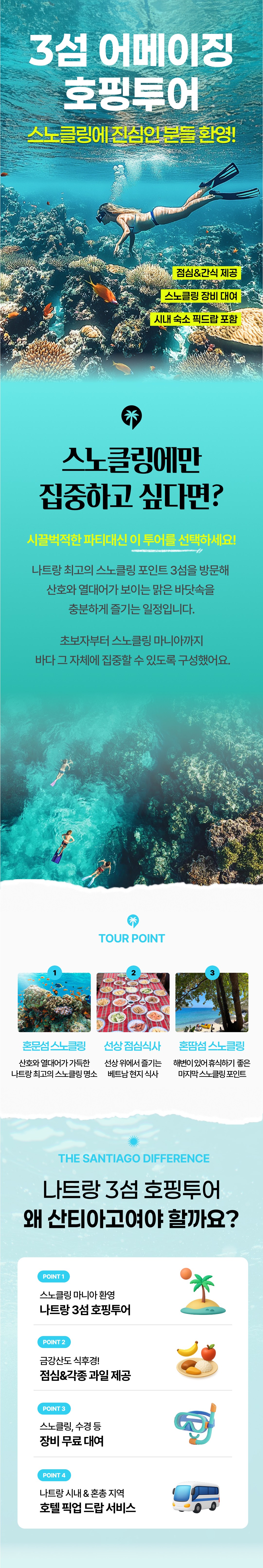 나트랑 3섬 어메이징 호핑투어 (스노쿨링, 픽업 드랍)