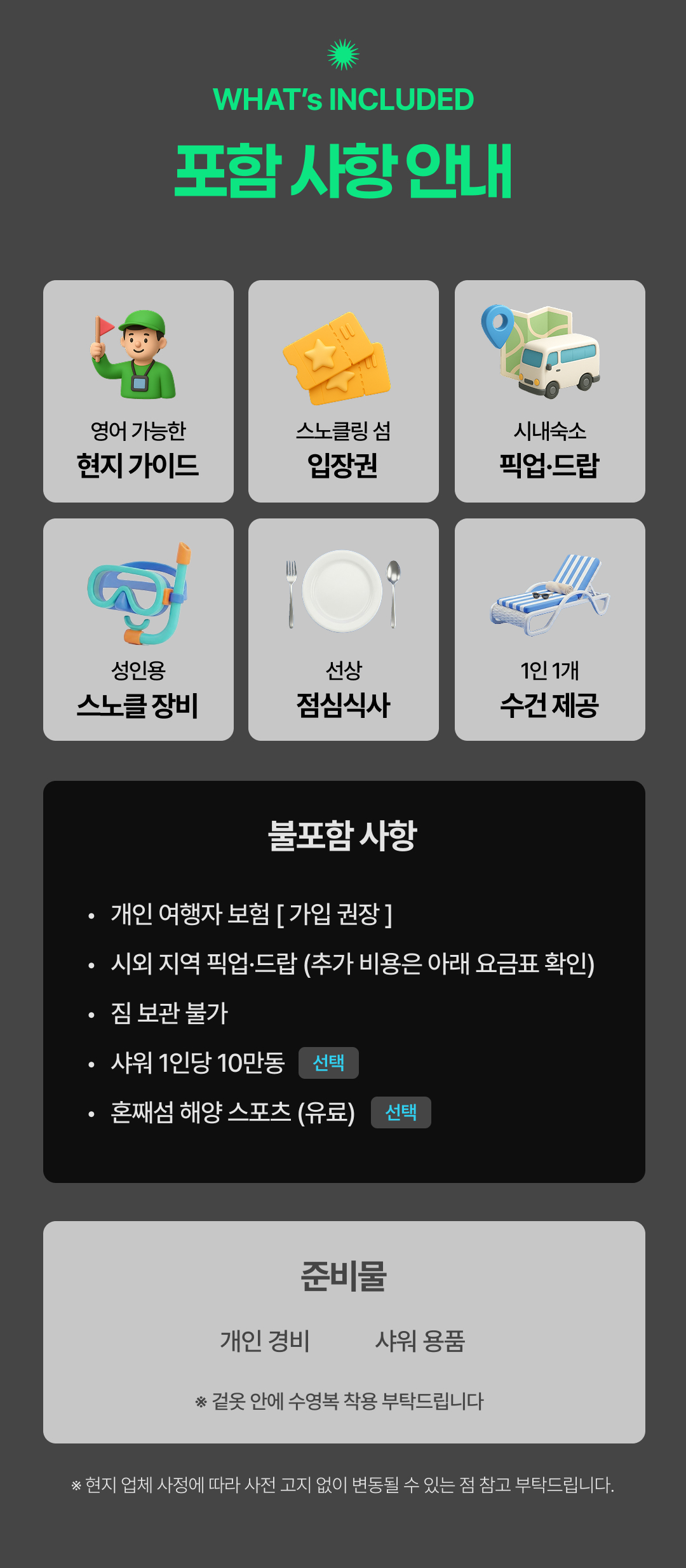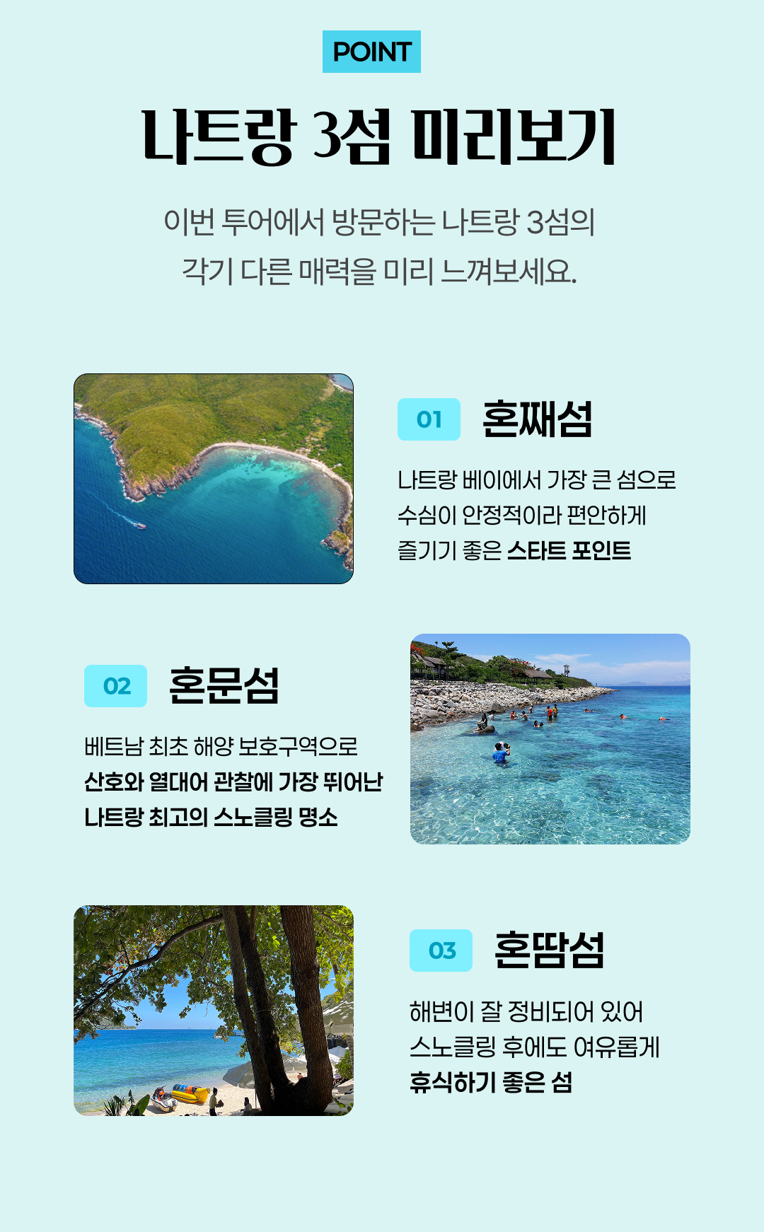 🤿 다양한 스노쿨링 포인트 (혼째섬, 혼문섬, 혼땀섬) 🌊 가성비 있는 호핑투어 🏝️ 베트남 가정식 제공 🛝 현지 업체 운영 해양 레저 (유료)