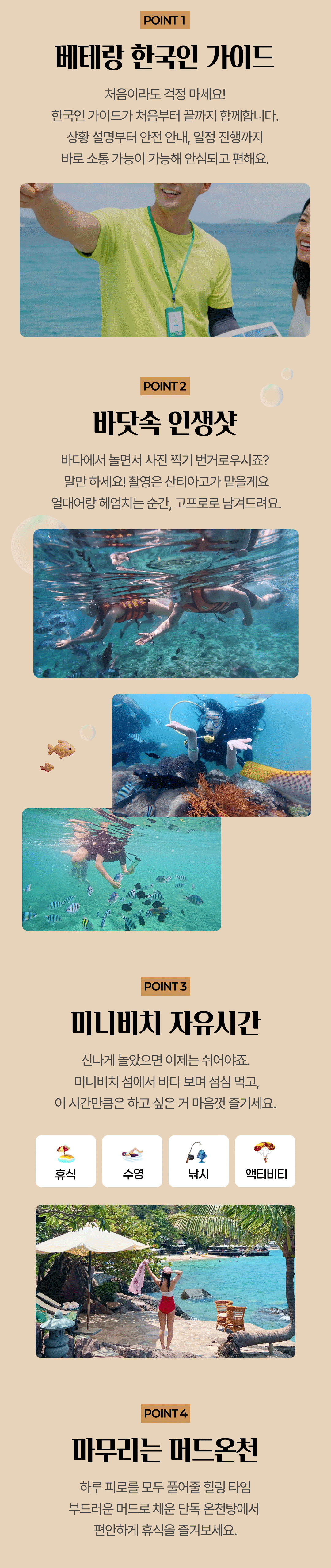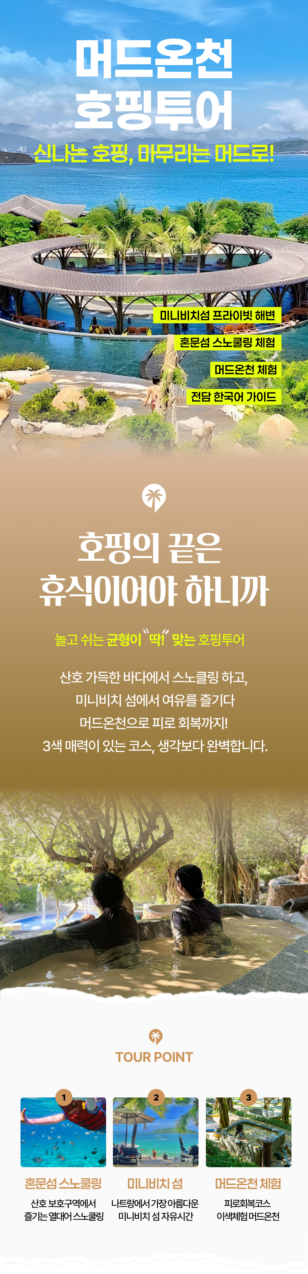 ⛱️ 나트랑 4성급 미니비치 섬에서 힐링 휴양 🤿 열대어 많은 혼문섬에서 스노쿨링 ♨️ 혼땀섬 머드온천으로 피로 개선 📷 스노쿨링 시 고프로 무료 촬영 서비스 👦🏻 한국어 가능한 현지 가이드, 한국인 가이드 인솔까지! 해당 상품은 머드온천 포함 상품입니다 😊