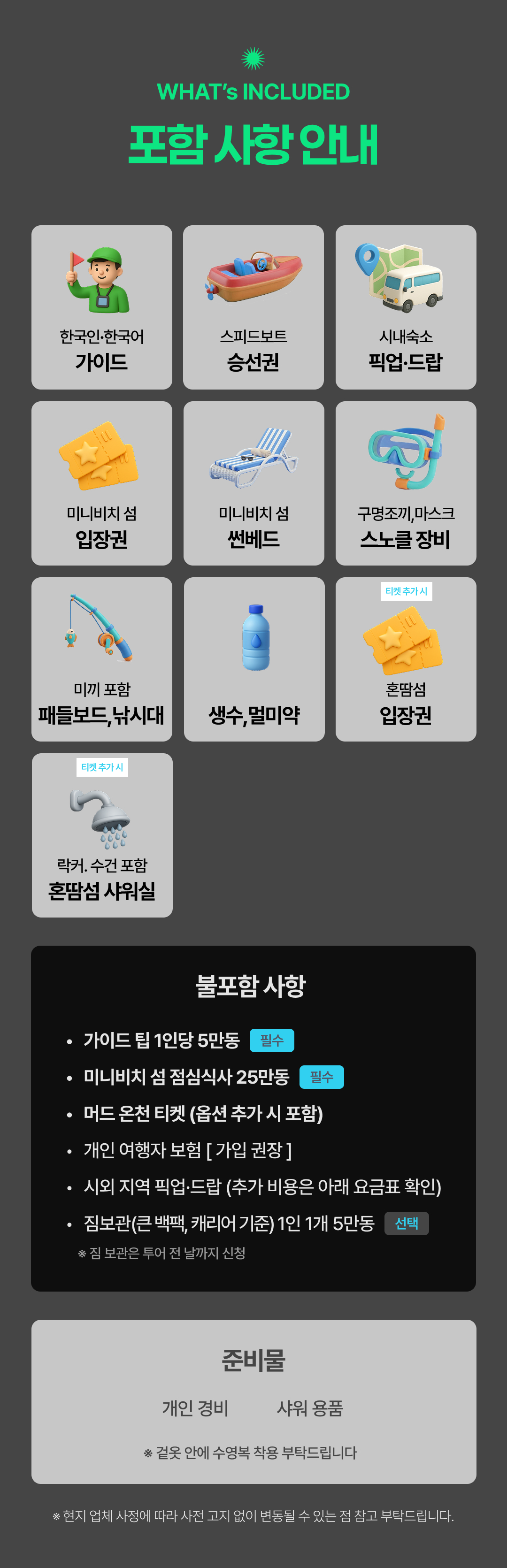 혼문섬에서 스노클링, 미니비치섬에서 힐링 시간, 혼땀섬에서 머드온천까지! 올인원 3섬 호핑투어 🩵