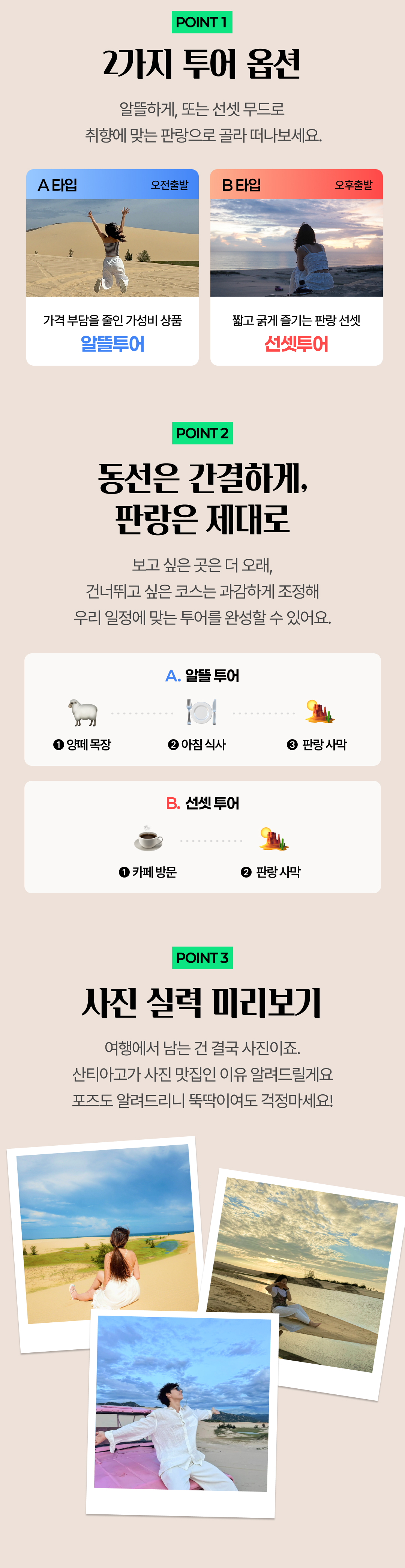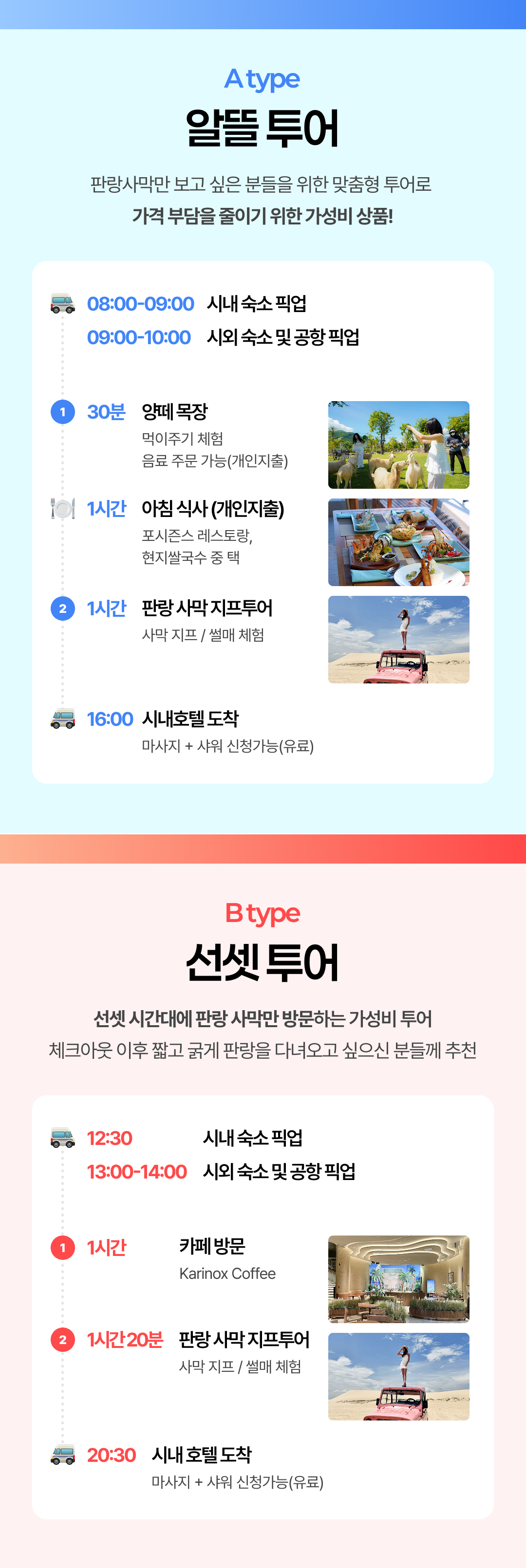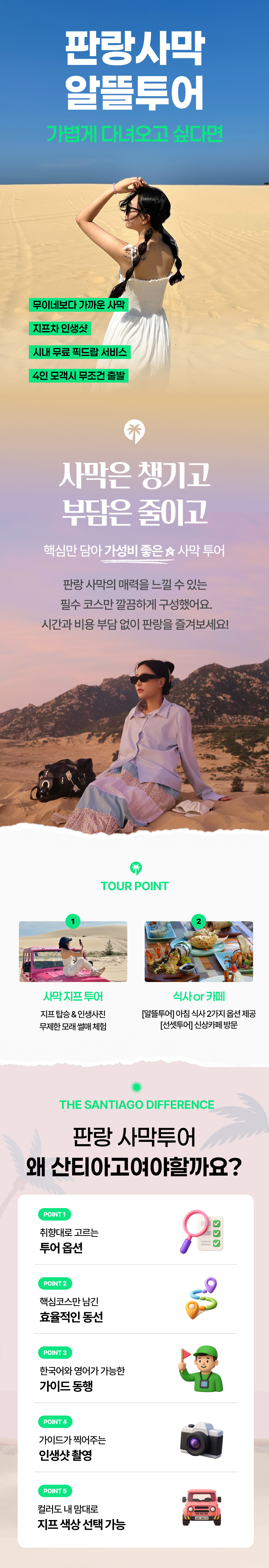 🌵 무이네보다 가까운 요즘 대세 판랑 사막 투어 📷 가이드가 찍어주는 인생샷 🛷 스릴 넘치는 지프 탑승, 모래 썰매 무료 체험 🚌 16인승 미니 벤으로 이동 📍 알뜰(반나절) 투어 또는 선셋투어 중 선택 가능한 짧은 코스 판랑투어
